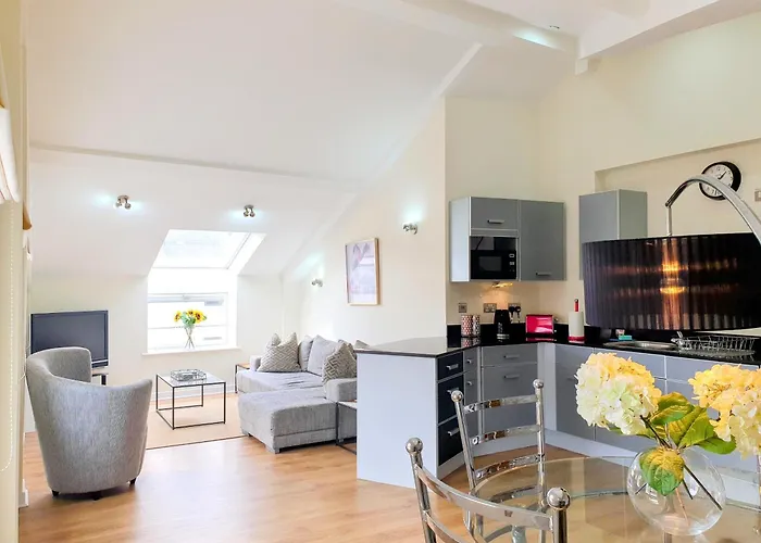 A The Penthouse At Regent House Light And Airy Top Floor With Lift Access 1 Bedroom En-Suite Luxury Apartment Ultra Central Location biztosít ülősarkot, konyhát és nappalit, emellett kilátást nyújt az utcára. Élvezze a szálláshely hajszárítóval, szárítóval és törölközőkkel felszerelt fürdőszobájának kényelmét. Külön WC és zuhanyzó is található.